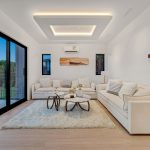 Expansive open-plan living areas with floor-to-ceiling windows, inviting in natural light and providing serene views of the beautifully maintained gardens.