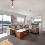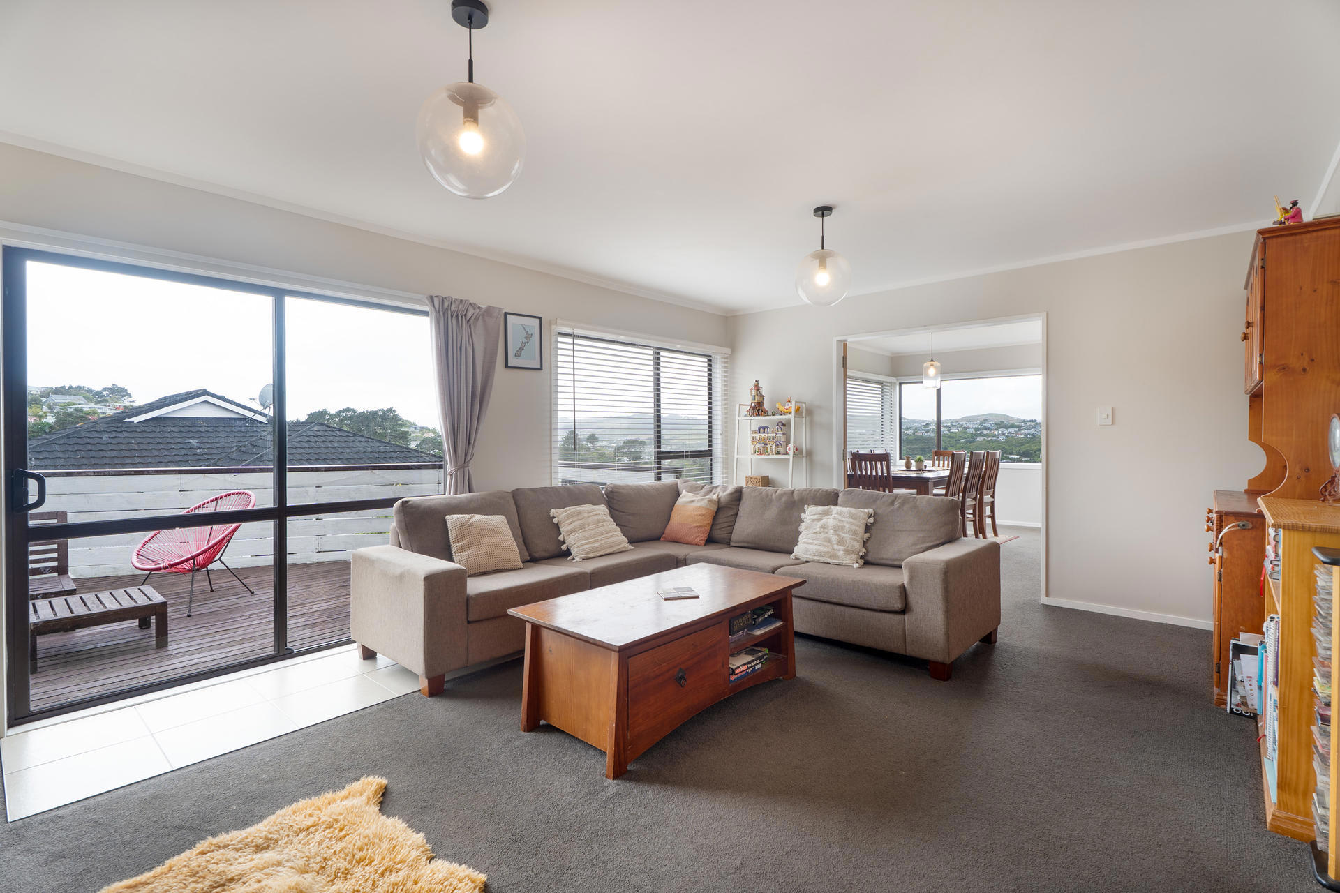 Upstairs to a big lounge with a large deck; open plan kitchen/dining room; two bedrooms, separate toilet, family bathroom and a study.
