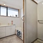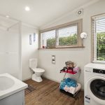 Double glazing in the living area, along with a floor-mounted heat pump, ensures warmth and energy efficiency throughout the year. The tidy bathroom is equipped with a shower, vanity, and a separate toilet, while a dedicated laundry area adds extra functionality.