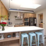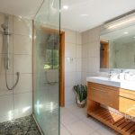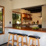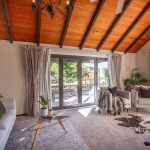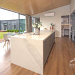 The striking kitchen with open plan dining connects seamlessly to both a sunny informal lounge and a formal lounge below with wood burner, opening to a west-facing deck and gazebo – perfect for entertaining.