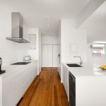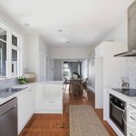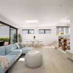 The visual experience continues into the modern kitchen, complete with oak joinery, engineered stone bench-tops, and Miele appliances. A built-in bar and powder toilet are within easy reach for guests.